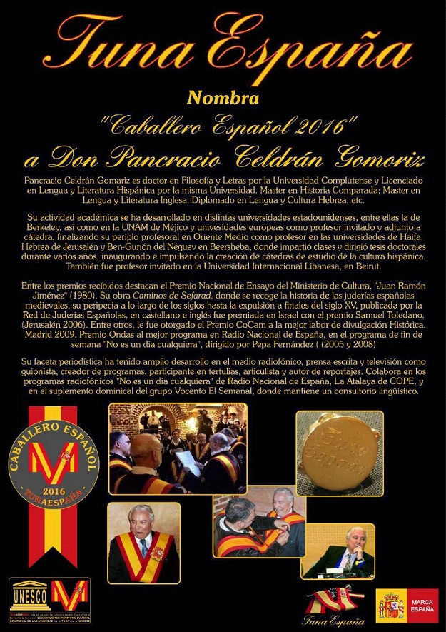 Tuna España celebró su IV Juntamento en Madrid, donde se reunieron 95 tunos para entregar la insignia de oro de ‘Caballero Español’ al doctor murciano Pancracio Celdrán Gomáriz, profesor durante varios años en la universidad Internacional Libanesa, en Beirut, en Haifa, Hebrea de Jerusalén y Ben Gurion en Beersheba, entre otras.