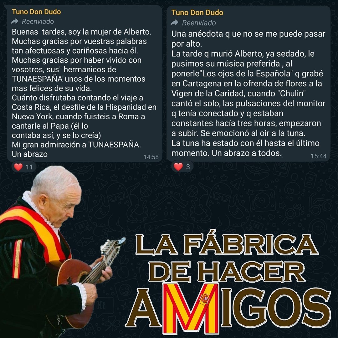 Dr. Don Carlos I. Espinosa Celdrán “DonDudo” Presidente Fundador de «TunaEspaña». Presidente Fundador de la «Asociación Nacional de Tunos Universitarios de España«. Caballero de Honor de la Goliardia Sovrano Commendevolissimo Ordine Goliardico San Salvi de La Universidad de Florencia, Italia . Tuna Facultad Derecho Universidad de Murcia. Cuarentuna Universitaria de Cartagena. Cuarentuna Universitaria de Valladolid. Cuarentuna Universitaria de Cádiz. Cuarentuna Ciudad de México. Cuarentuna Universitaria de Puerto Rico. Cuarentuna Universitaria de Panamá. Cuarentuna de Ciudad Victoria, Tamaulipas, México. Tuna del Cantón , China. Tuna Distrito de Colombia. Componente del “Son Del Malecón”. Tuna de Rusia, Tuna de Japón. GALENO.